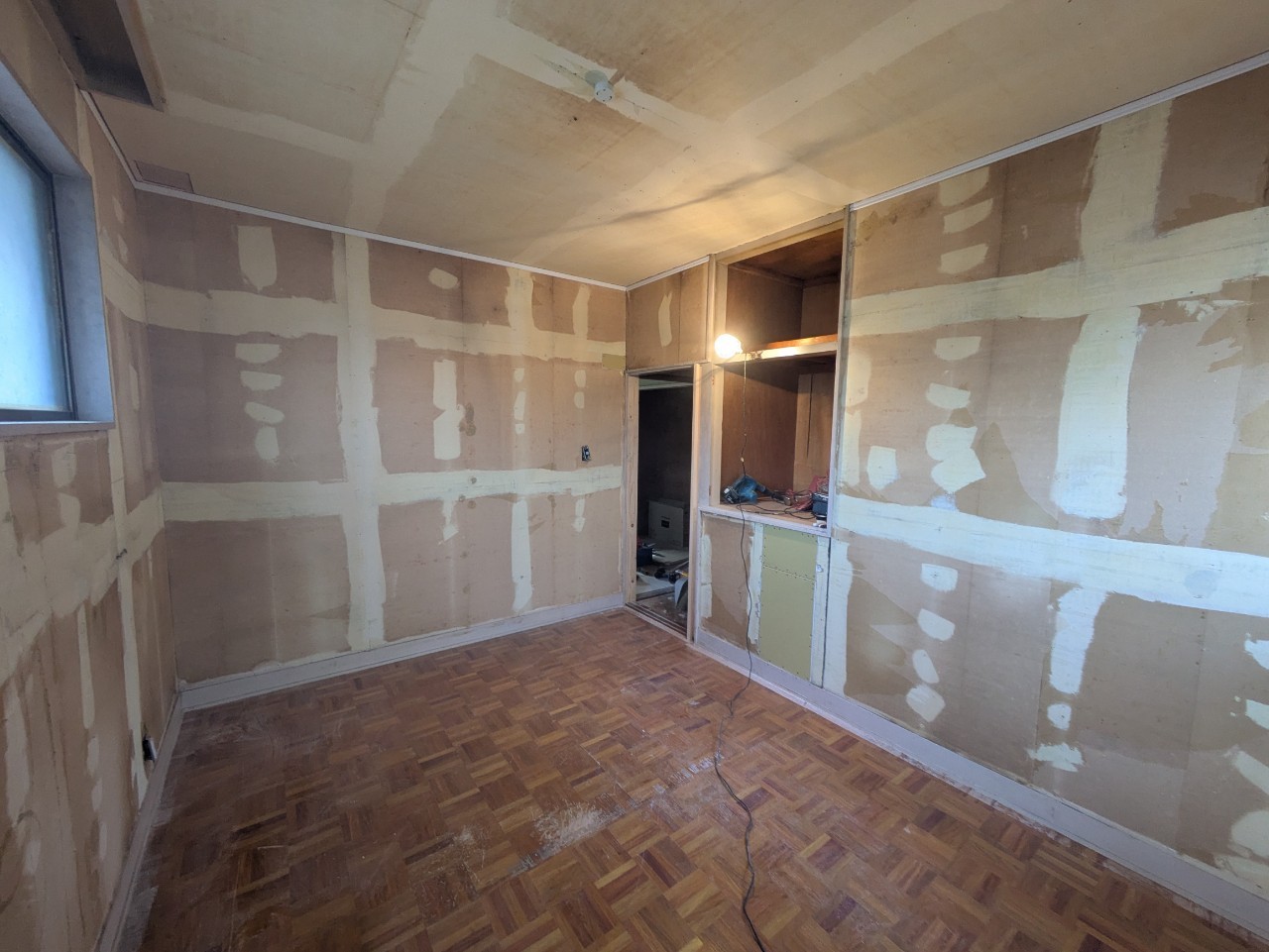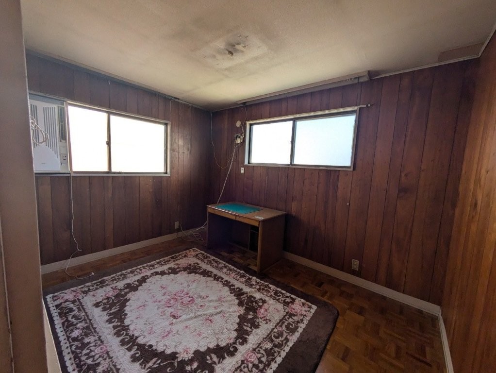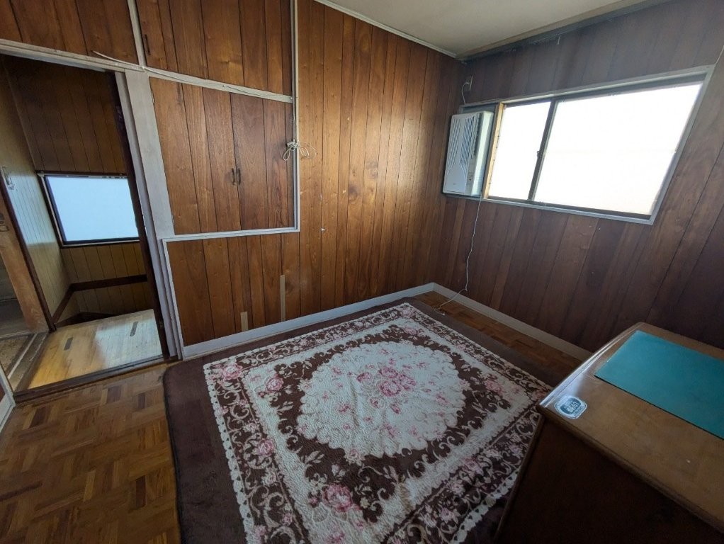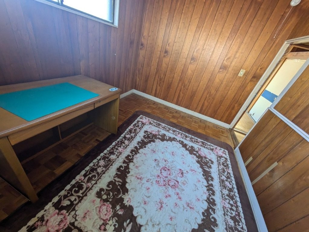 床は古い寄木フローリングのまま傷や汚れが残り、全体的に「昭和のまま時間が止まった部屋」という印象。