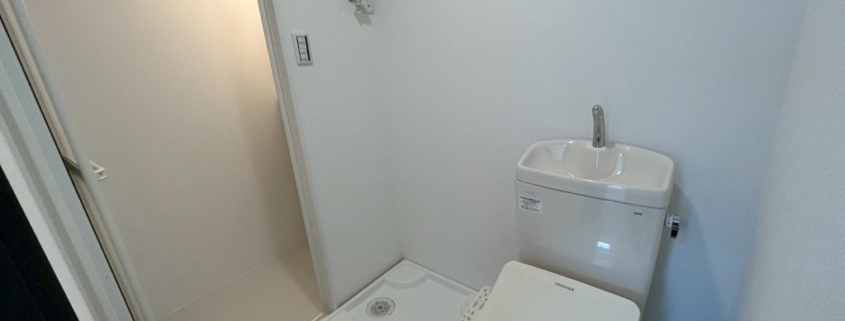 水回りを「独立シャワールーム+トイレ+洗濯機置き場」に再構成することで、内見時の印象と日常の使い勝手を同時に改善。 空室対策と資産価値維持につながる改修です。